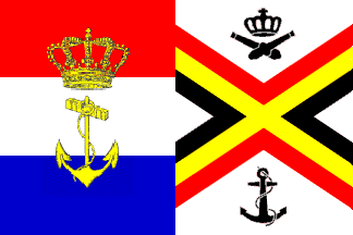 The Belgian Flotilla Admiral J. Rosiers proposed for Admiral Benelux a flag which was not accepted. The flag was white with the saltire characteristic of the Belgian ensign. Two of the lateral branches of the cross kept the Belgian colours, whereas the two others were made Dutch. In the middle, a white disc was charged with a yellow Royal crown and fouled anchor and placed over the cross, thus avoiding the unaesthetical contact between the colours of the two countries.