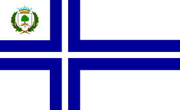 The arms of the Town of Porvoo with a yellow edge and crowned with a yellow mural crown. Along the sides of the shield two oak leaf twigs are bending, tied together below with a blue bow.