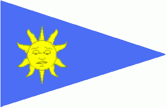 It is a blue triangular pennant with a yellow sun, having a face and ten rays,