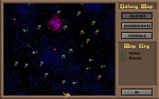 It should be noted that the choice of color is not limited by the choice of the player's species ("race", in English-language SF parlance, strange as it is) — meaning that each player can bear any of the six colors and play any of the ten species (Klackon, Meklar, Sakkra, Psilon, Mrrshans, Alkari, Bulrathi, Humans, Silicoid, and Darlock).