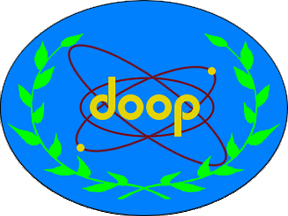 Dark blue field, with a light green wreath, "doop" in yellow lowercase letters in the center surrounded by three overlapping red ovals, probably representing planetary orbits. One oval has two red dots on it.