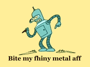 It shows the rattlesnake replaced with the likeness of Bender the robot, likewise in an aggressive stance, and the legend changed to read «Bite my fhiny metal aff» — this is supposed to read «Bite my shiny metal ass», with letters "f" standing for the correct sharp "s": "ſ" (the proper spelling for the last word would have been "aſs", however).