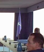 Astronautics is addressing a meeting. Behind him are two flags —