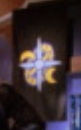 Castalia : blue with a 'Q'-shaped symbol in gold. It is draped on a