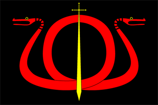 The flag of the Torumekian Empire — Torumekia for short — is briefly but clearly visible in the movie: With proportions about 2:3 or 3:5, on a black field, a red snake with two heads, one on each end, the body of which does a pretty loop in the middle, and a vertical golden sword on top of them. This symbol (snakes and sword) occupy almost the complete totality of the flag. The snake has a number of black stripes near its heads, the exact number of which I couldn't figure out, and it seems not to have any teeth. The sword has more details in the movie to make it look golden and shiny, but I think this is a good heraldic approach to that.