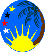 Four horizontal stripes, yellow, blue, red and white, and a blue oval placed near the hoist on the top three stripes, showing a brown-trunked, green leaved and fruited coconut tree, a large yellow rising sun and four stars in yellow, black, red and white.
