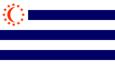 Seven horizontal stripes, white and blue, the bottom stripe being half-width of the others, a white square three stripes deep in the canton, bearing a red crescent surrounded by a ring of 12 red stars.