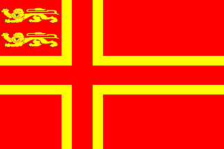 While driving through Normandy on 2 January 2001, I noticed flags on the roundabouts on the ring road around Falaise which combine the usual flag of Normandy and the flag of the Mouvement Normand. The Scandinavian Cross (red on gold on red) had in the canton the two lions/leopards from the banner of arms.