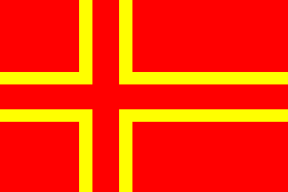 The flag of Mouvement Normand is red with a yellow Scandinavian cross voided and filled in red.