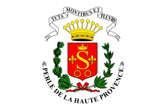 On the flag, the shield is surmonted by a golden crown itself surmonted by a scroll bearing the Latin motto of the city, tuta montibus et fluviis (all by the mountains and the rivers), surrounded by two branches tied below the shield by a red ribbon. A third nickname of the city, Perle de la Haute Provence (Pearl of Upper-Provence) is added below the branches.
