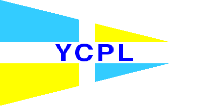 Yacht Club de Port-Leucate has a 1:2 burgee divided by a white cross, whose vertical arm is narrower than the horizontal. Quarters are light blue, yellow, yellow and light blue. Initials Y C P L in blue are placed horizontally in the white stripe.