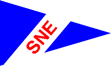The burgee of the SNE is blue with a white ascending diagonal stripe charged with the red letters "SNE".