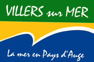 The flag of Villers-sur-Mer is made of the municipal logo. The motto La mer en pays d'Auge means "The sea in pays d'Auge", pays d'Auge being the area limited by rivers Touques and Dive, mostly known for the three local cheeses (camembert, livarot, pont-l'évêque) and apple-derived products (cider and calvados).