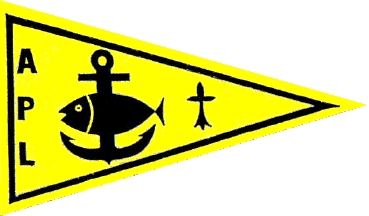 The burgee of APL, as shown graphically on the APL website, is yellow with a black border, a black anchor and a fish, a black ermine spot and the letters "APL" placed vertically along the hoist.