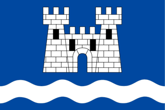 accompagné en pointe d'une fasce ondée d'argent (Azure a castle double towered argent masoned and pierced sable in base