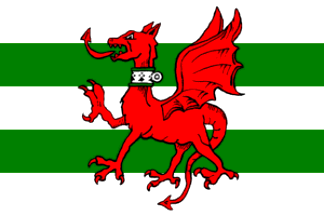 The flag of Plomelin is white with two green stripes and a red dragon.