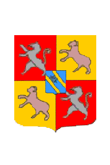 Écartelé au 1 et 4 de gueules à un lion d'argent ; au 2 et 3 d'or à un bélier de sable rampant, et sur le tout d'azur à deux bandes d'or et une rose d'argent, tigée et feuillée de même, posée entre les deux