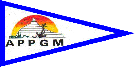 burgee of APPGM (drawing and photos). The burgee is white with a blue border and the former logo of APPGM, made of a white "pyramid" representing the local architecture over a red-orange half-sun, in the foreground boats and a fouled anchor, below the black letters "APPGM".