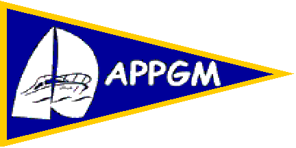 The burgee of the APPGM (drawing) is blue with a golden border, charged with two white sails and a motorboat all over, and the white letters "APPGM".