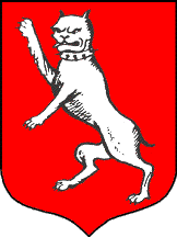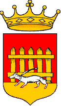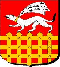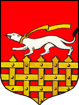 De gueules à la herse d'or, sommée d'une hermine au naturel, lampassée de sable, colletée et bouclée aussi d'or, cravatée d'une écharpe d'hermine voletant sur son dos. (GASO)