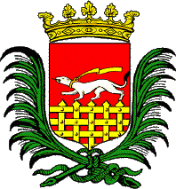 According to the municipal website, the modern muncipal coat of arms uses d'Hozier's shield with either a ducal or mural crown, and sometimes with green palms as supporters. The latter design would be the greater coat of arms. The arms commonly used are said to be similar but without the palms.