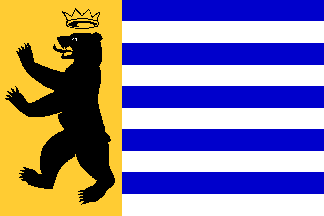 The flag has ten horizontal, alternating blue and white stripes. Along the hoist is placed a wide vertical yellow stripe, charged with a standing black bear (in