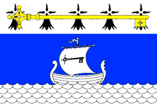 The flag (photo), proposed by Jakez Lhéritier and designed by Romuald Renaud, is based "on the traditions and customs of the Duchy of Brittany". It is quartered by a black cross cantonned with five black ermine spots (3 + 2). The canton, derived from the municipal arms, is blue with the white sailing ship on the white sea. The black key decorating the sail was changed for a yellow key, recalling the omitted chief of the arms, and more visible on the flag.