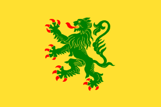 The flag of Bricquebec is yellow with a green lion having red tongue and claws.