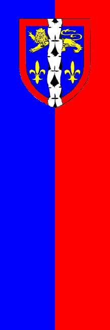 The General Council of Mayenne has set up a partnership with the German District of Swabia. The hall where the partnership convention was signed was decorated with vertical banners, including a banner of the Department of Mayenne, probably made specifically for the event, vertically divided blue-red with the department's coat of arms overall in the upper part of the flag.