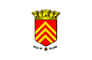 The flag of Lillers, as seen in the town, is white with the municipal coat of arms, "Gules three chevrons or", and the name of the town written beneath the shield.