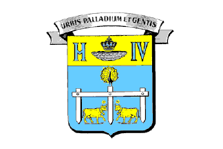 On the flag, the municipal arms are surmonted by a scroll bearing the municipal motto, Urbis palladium et gentis, in Latin,"Safeguarding of the Town and of the Nation".