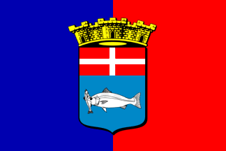 The flag of Évian, as seen on the Town Hall (December 2002), is vertically divided blue-red with the municipal coat of arms placed in the middle.