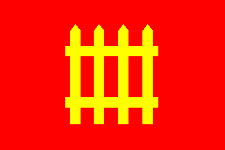 The flag of Thônes is red with a yellow barrier. The flag is a banner of the municipal arms, "Gules, a barrier or."