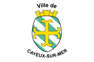 The flag of Cayeux-sur-Mer, seen in several places in Cayeux and Le Hourdel, is white with the municipal coat of arms, surmounted by a yellow mural crown and the black writing "Ville de" (Town of) and surmounting the black writing "CAYEUX-SUR-MER".