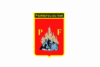The flag of Pierrefeu-du-Var, as seen in July 2013 is white with the municipal coat of arms, outlined in yellow and surmounted by a black cartouche, also outlined in yellow and inscribed with "PIERREFEU-DU-VAR" yellow letters.