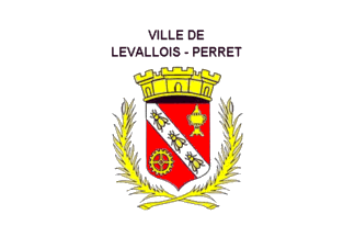 The flag of Levallois-Perret, as communicated by the municipal administration, is white with the municipal coat of arms placed in the middle of the flag, surmonted by VILLE DE / LEVALLOIS - PERRET, in black letters.