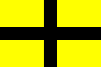 A white flag, in ratio 3:4, divided by a black cross fimbriated in white and