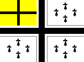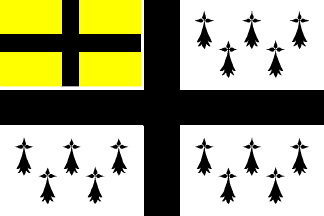 Raphaël Vinet improved the flag, quartered by the Breton black cross. The canton is yellow, quartered with another black cross. The three other quarters are white, charged with five black ermine spots placed 3 + 2.