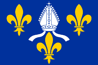 The flag of Saintonge is a banner of the arms D'azur à la mitre d'argent accompagnée de trois fleurs de lys d'or (Azure a bishop's mitre argent between three fleurs de lis or two in chief and one in base), assigned to the province by Jacques Meurgey in his Notice historique sur les blasons des anciennes provinces de France (Historical note on the coats of arms of the ancient French provinces, 1941).