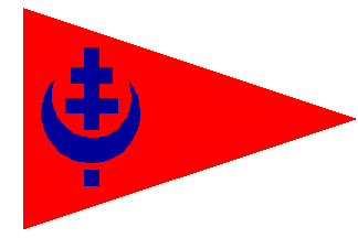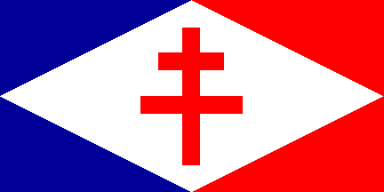 and died for the Free France. According to L. Philippe (Franciae Vexilla [frv] #14/60, 1999), Mezan used a triangular red flag with a white vertical stripe along the hoist, and a blue emblem made of a blue crescent superimposed to a blue cross of Lorraine.