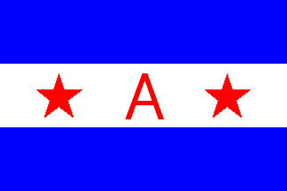 The house flag of Achaque is horizontally divided blue-white-blue with a red "A" flanked by two red stars in the white stripe.