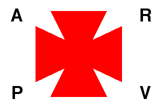 The house flag of ARPV (same source as above) is white with a thick red cross patty in the middle, surrounded by the letters "A", "R", "P" and "V", placed in the respective corners of the flag.