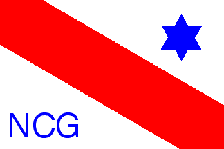The house flag of Norbert & Claude Guillon is shown by Louis Lacroix (Les Derniers grands voiliers. Histoire des long-courriers nantais de 1893 à 1931) as white with a red descending diagonal stripe, in upper fly a blue six-pointed star, in lower hoist the blue letters "NCG".
