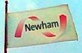 of the Thames near the borough, ending in an upward pointing arrow. The text "Newham"