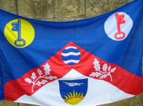 The flag of the London Borough of Havering is white with coat of arms on it: