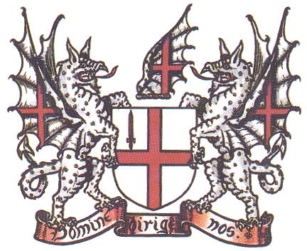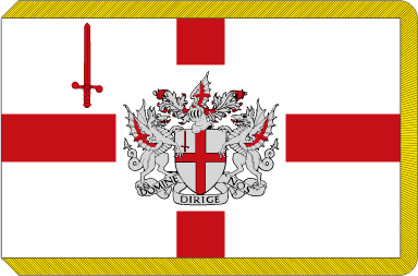 This is the banner of arms of the Corporation of the City of London. Note however that the City of London does not include all of what is commonly known as London, but the ancient city only, from Fleet St eastward ("the Square Mile"), which is now the financial centre of London. Its authority does not extend to the adjacent City of Westminster, nor to the surrounding boroughs, which together constitute Greater London.