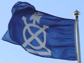 The flag features a large version of 'The Bridge Mark', in white on a mid blue