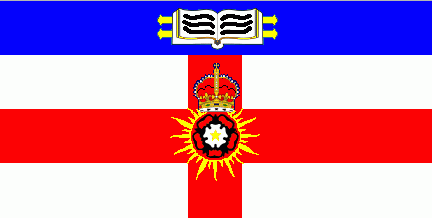 St. George. At the top edge is a blue stripe with an open book on its centre. In