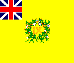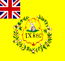 I am sending a drawing of the 9th Foot regimental colour which was presented c. 1757. This is based on an almost identical illustration in John Mollo's Uniforms of the American Revolution and the central device is identical to a black and white one in Dino Lemonifides's British Infantry Colours shown as an example of the rococo style (i.e lopsided and asymmetrical wreath) prevalent in the 1760s. This colour is erroneously portrayed as current during the 1770s, but in fact it was replaced before the American revolution (1772) by another with a different style wreath, for which I also send a drawing. This is illustrated in Terence Wise's Military Flags of the World in Colour. This style would appear to be an intermediate phase between the asymetrical rococo and the 1780s symmetrical-style wreath enclosing the regimental number on a shield. For good measure I am also sending the regimental colour of the 9th Foot c. 1807 since it also appears in the Lemonofides book. This includes the regiment's new badge of the figure of Britannia, and yet another style of wreath.