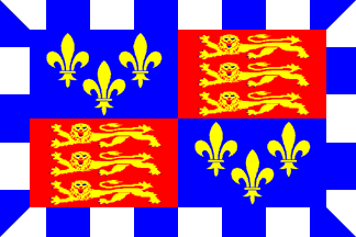 Flag is quartered, first and fourth azure, three fleur de lys or, second and third gules, three lions passant or; a bordure azure and argent.